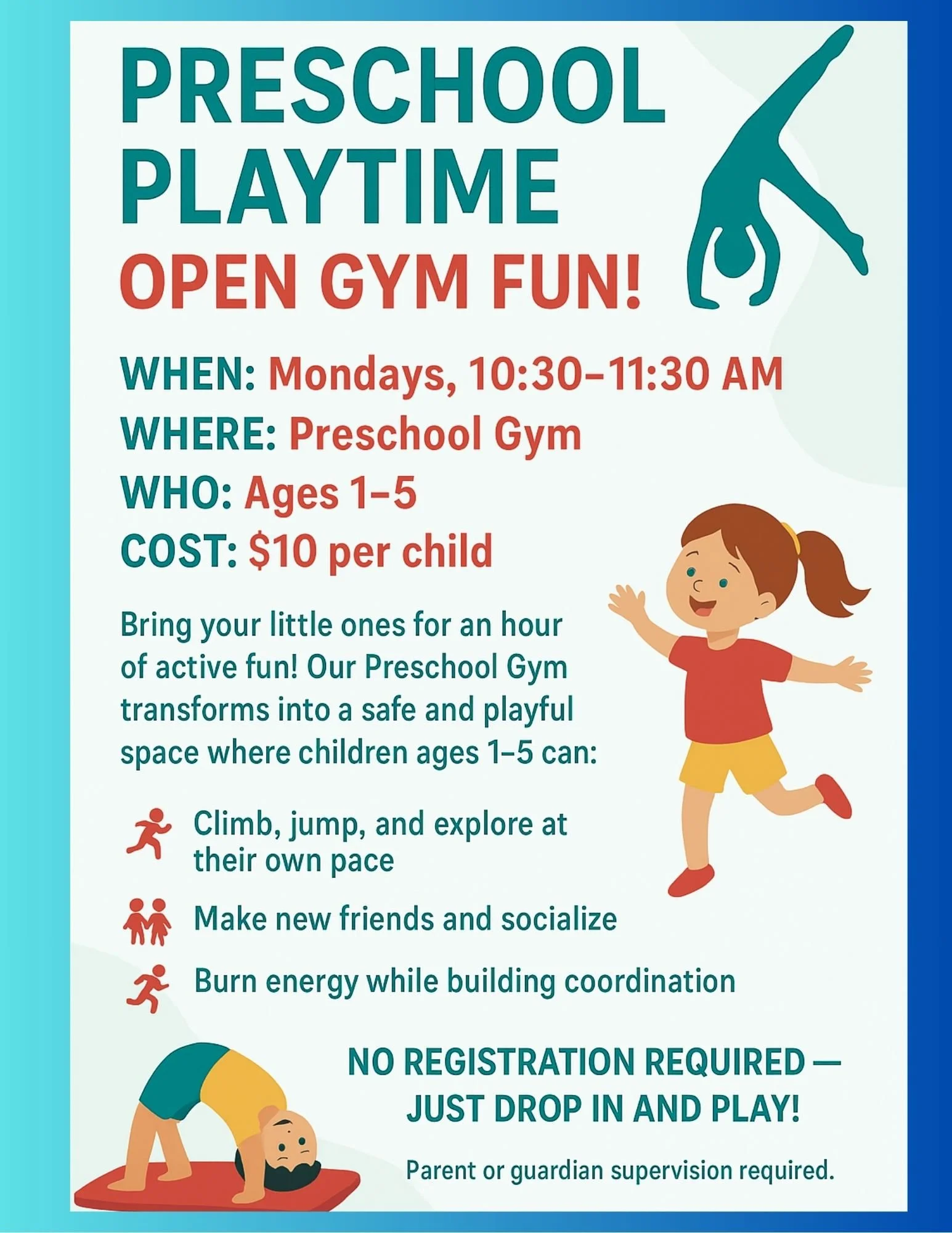Playtime for our little ones to have fun in the Preschool gym! Parental assistance required for ages 1-3, parents required to reside in preschool gym for ages 4-5. Drop In Event & Online Registration.
